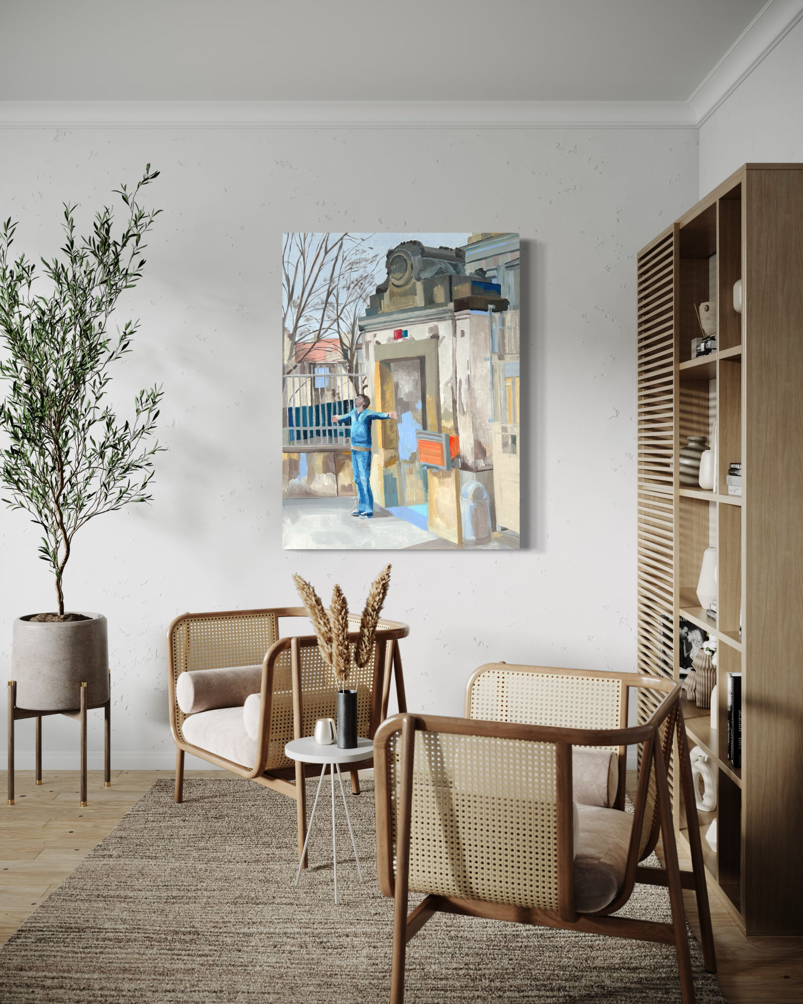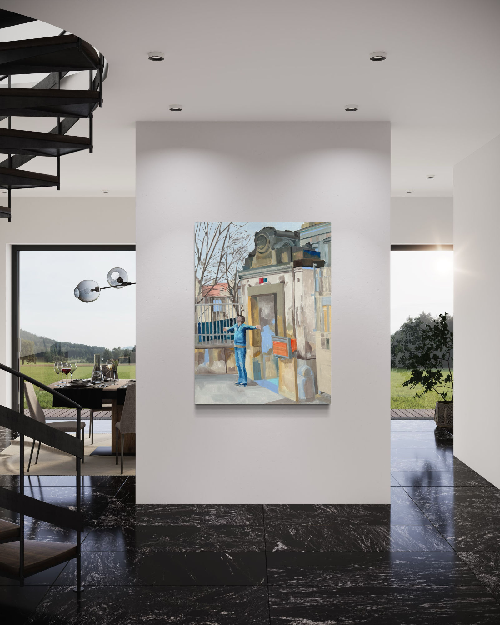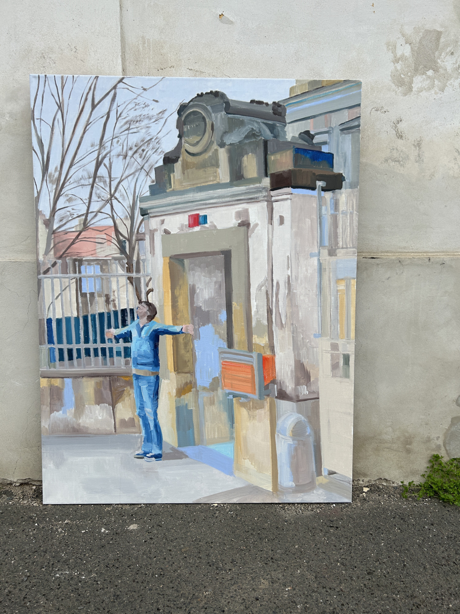 Motiv na tomto obraze je skutečné místo, které se nachází blízko zastávky Odra. Když jsem se vydal sbírat motivy do parku a poté jsem vyšel před hlavní budovu psychiatrické nemocnice Bohnice, byl jsem rozhodnutý převést tuto situaci na plátno. Do parku jsem chodil častěji jedno období malovat a vznikl cyklus obrazů, ve kterých se opakují různé pohledy na exteriéry, fasády domů, architekturu atd. Mezitím vznikaly obrazy, na kterých se objevují i postavy. Tento obraz jsem namaloval v lednu v roce 2021.