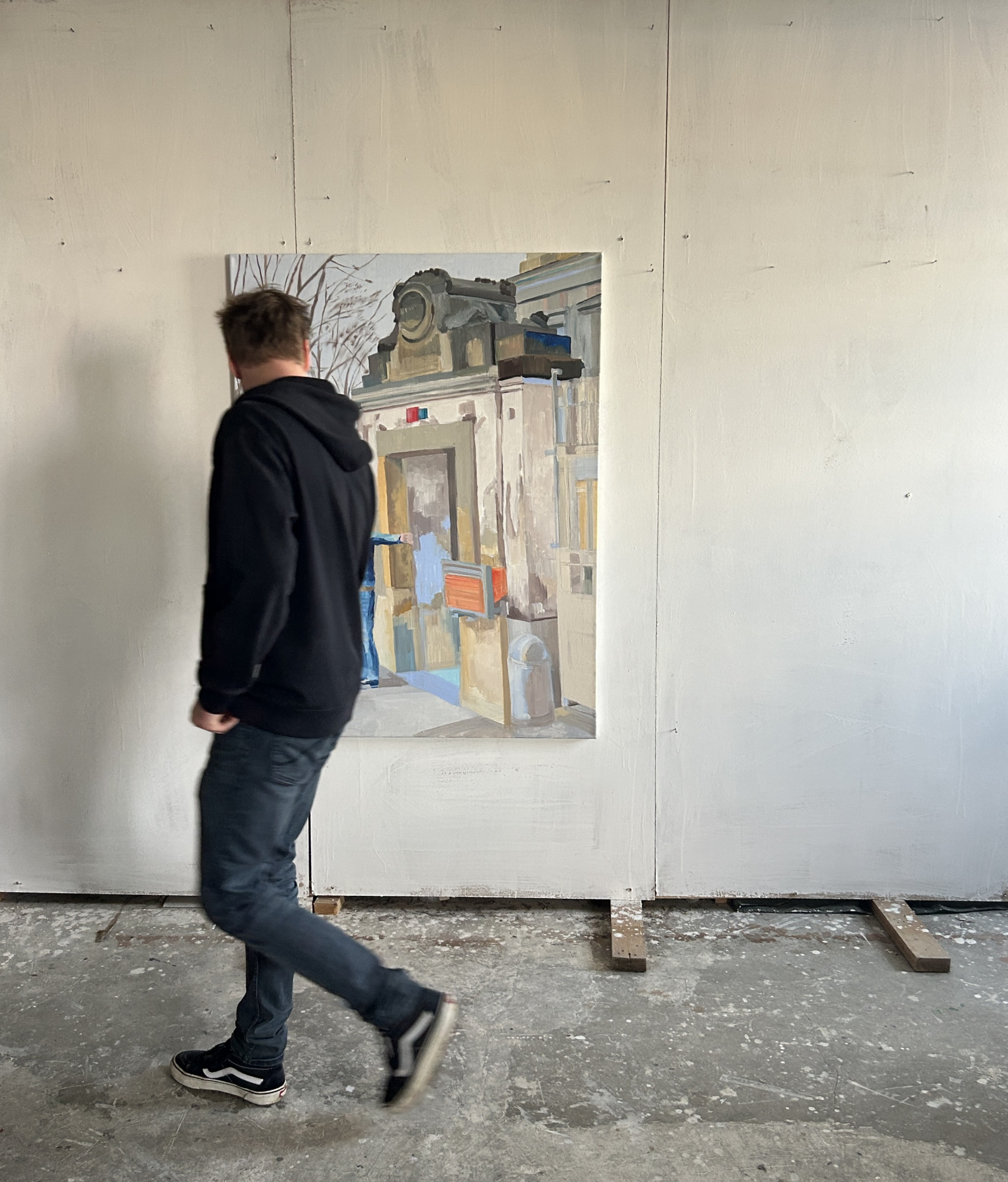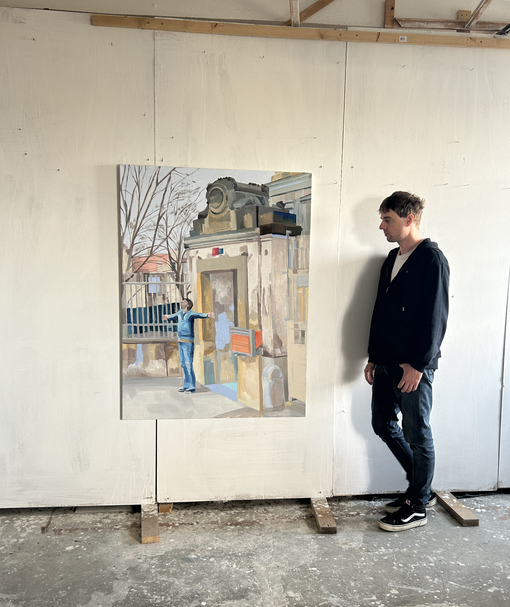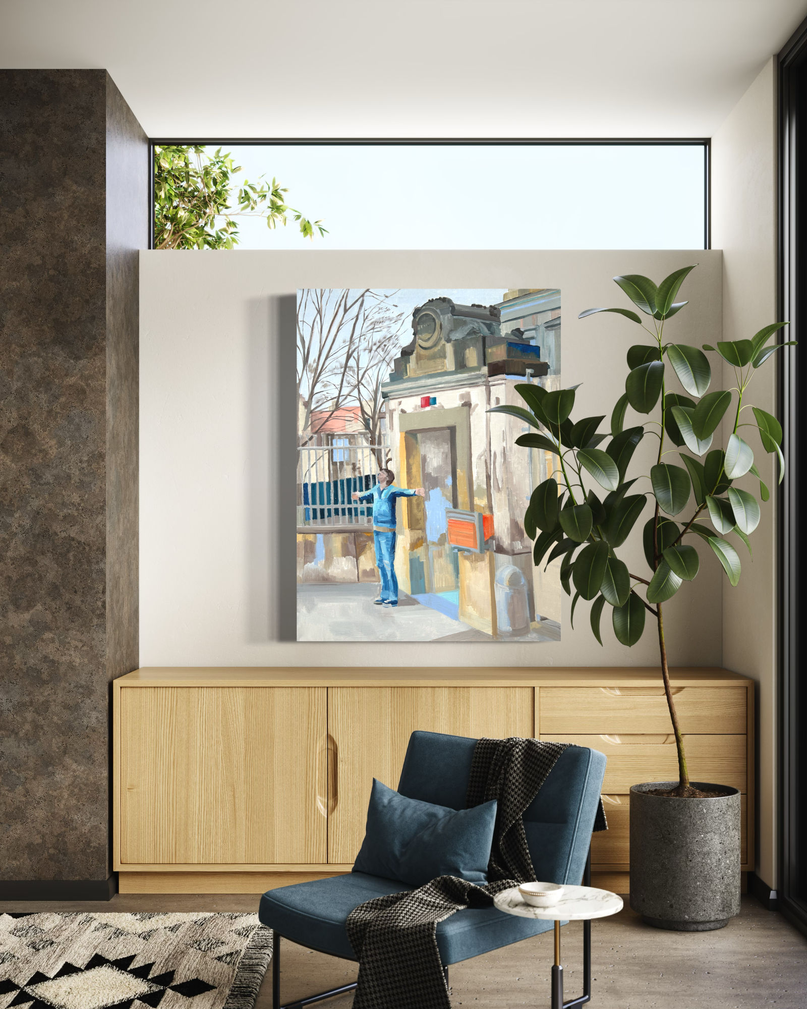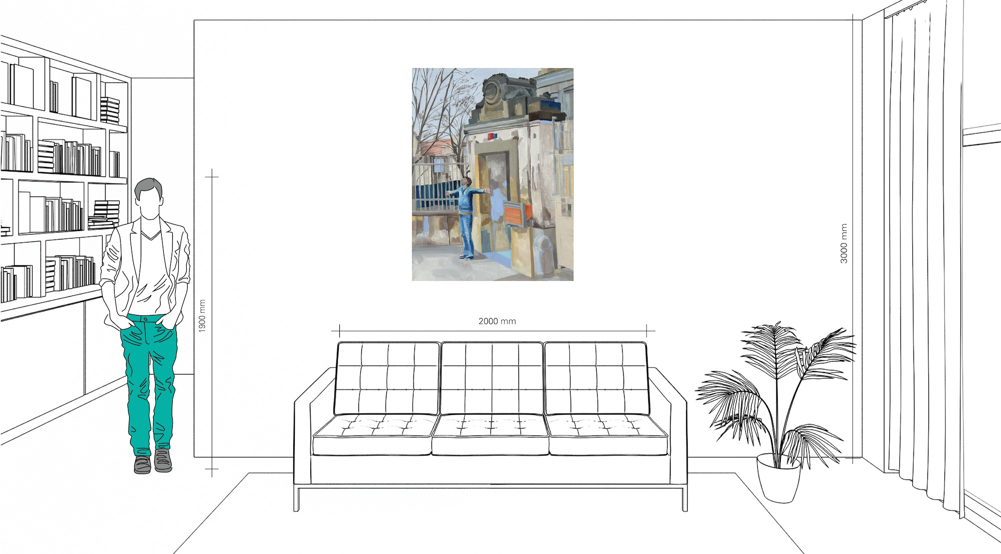 Motiv na tomto obraze je skutečné místo, které se nachází blízko zastávky Odra. Když jsem se vydal sbírat motivy do parku a poté jsem vyšel před hlavní budovu psychiatrické nemocnice Bohnice, byl jsem rozhodnutý převést tuto situaci na plátno. Do parku jsem chodil častěji jedno období malovat a vznikl cyklus obrazů, ve kterých se opakují různé pohledy na exteriéry, fasády domů, architekturu atd. Mezitím vznikaly obrazy, na kterých se objevují i postavy. Tento obraz jsem namaloval v lednu v roce 2021.
